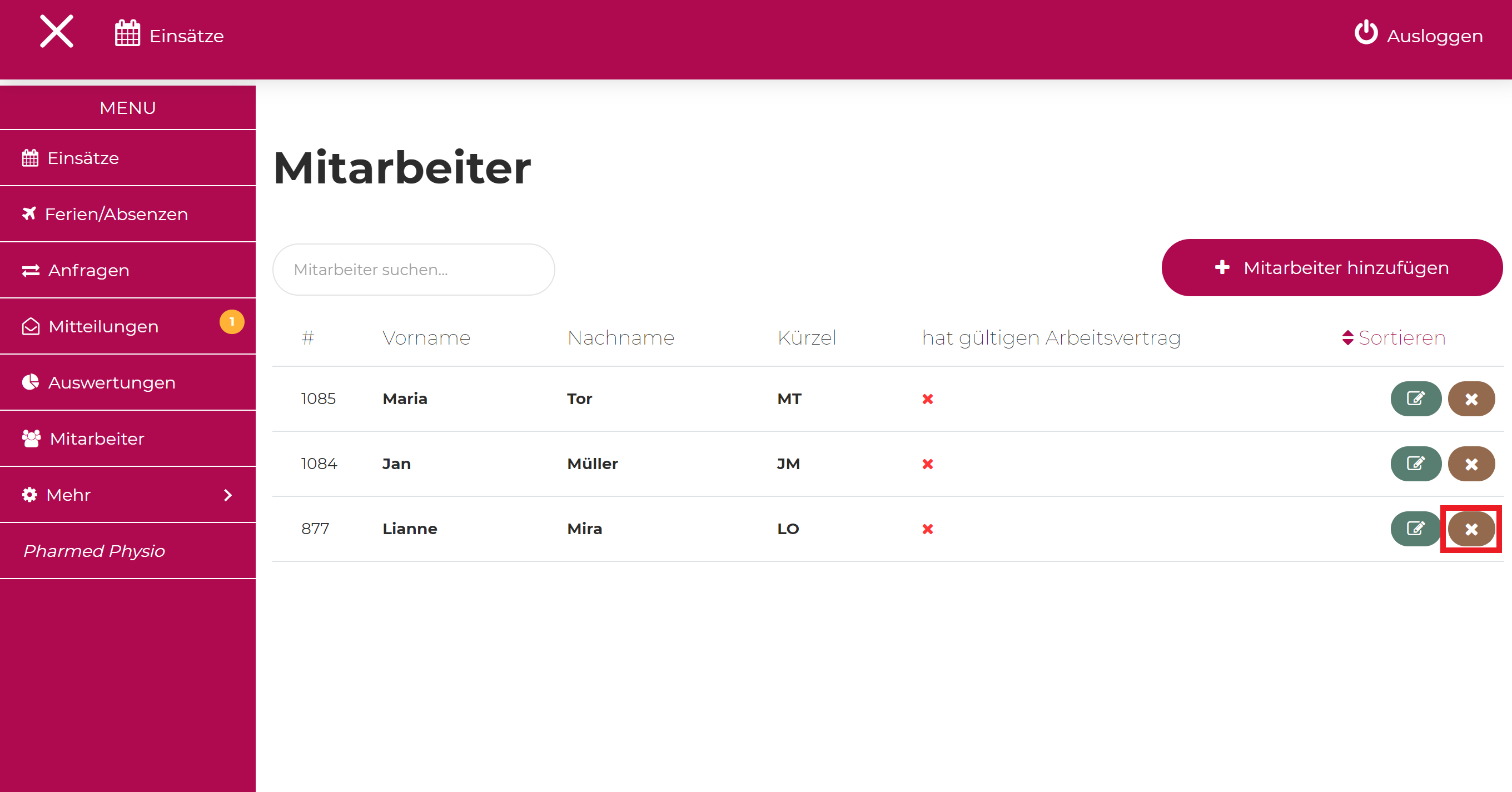 Sur la ligne de chaque collaborateur, il y a un symbole en forme de crayon (pour modifier les données du collaborateur) et un symbole en forme de croix - ce symbole en forme de croix est utilisé pour désactiver avec succès un collaborateur. Cliquez maintenant sur ce symbole pour le collaborateur que vous souhaitez désactiver.