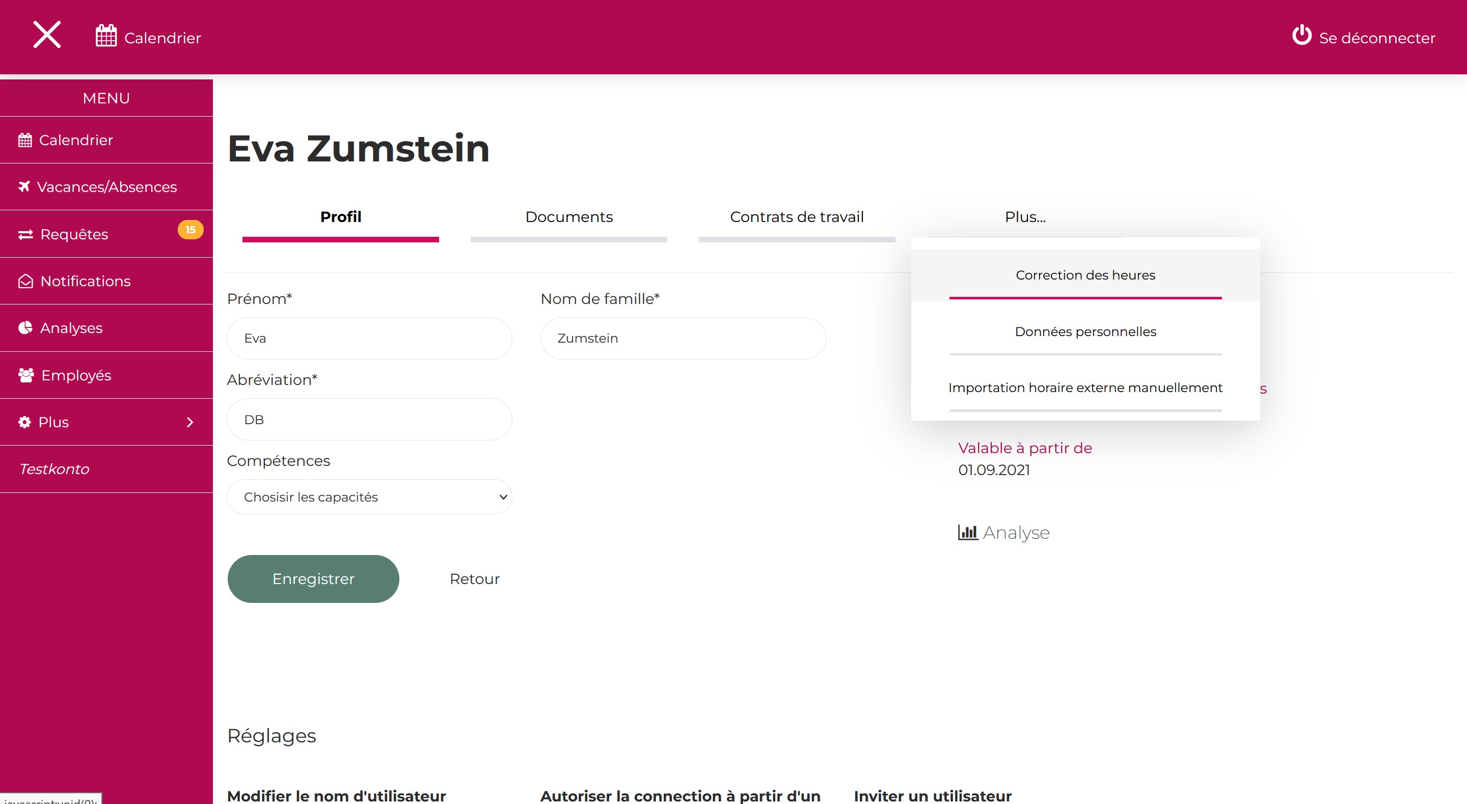 Si ces heures supplémentaires doivent être payées, il faut procéder à une correction des heures. Pour cela, il faut se rendre sur le collaborateur, choisir Modifier et ensuite, dans la navigation supérieure, cliquer sur Plus.