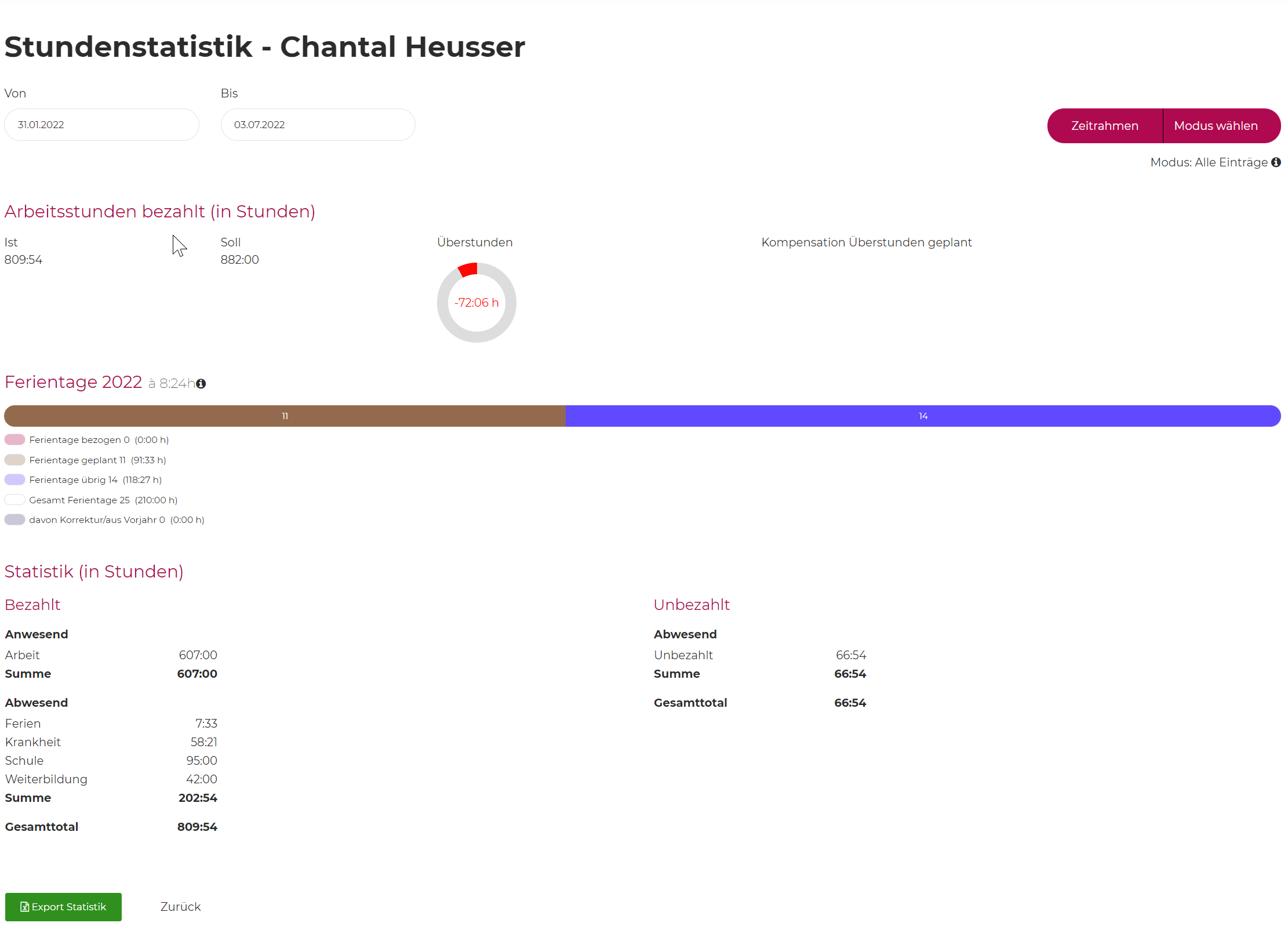 In dieser Darstellung werden auch die Stundenkategorien summarisch aufgelistet. So haben Sie sofort einen Überblick, wie oft eine Person krank war, wie viele Stunden in Weiterbildung investeiert wurde oder andere Kategorien.