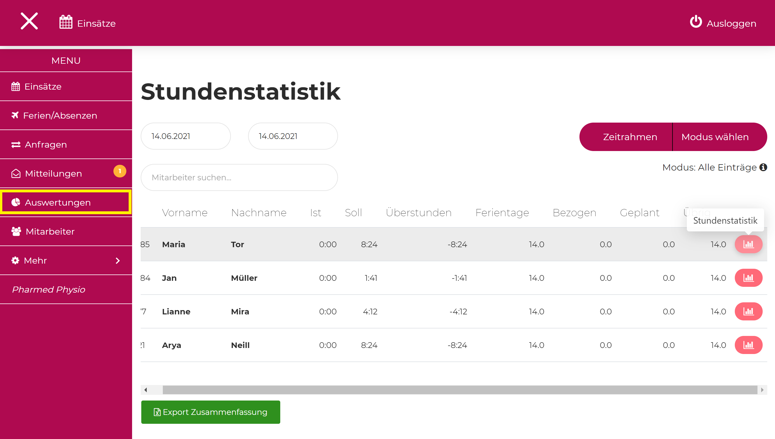 Die Auswertungen sieht man unter der Schaltfläche 'Auswertungen'. Wenn ein Vertrag endet, kann man dort die Anzahl Überstunden und den übrigen Anspruch auf Ferien in Stunden einsehen.