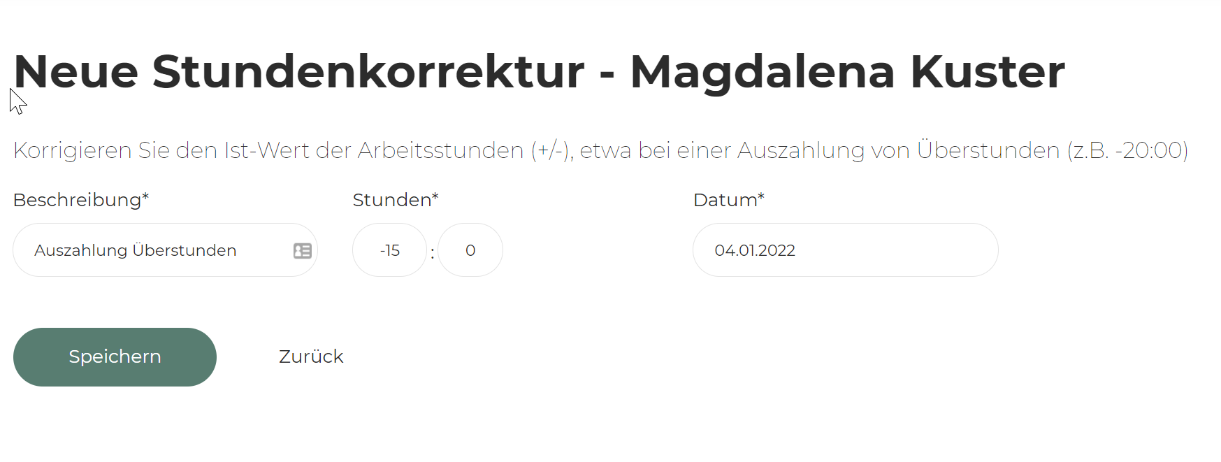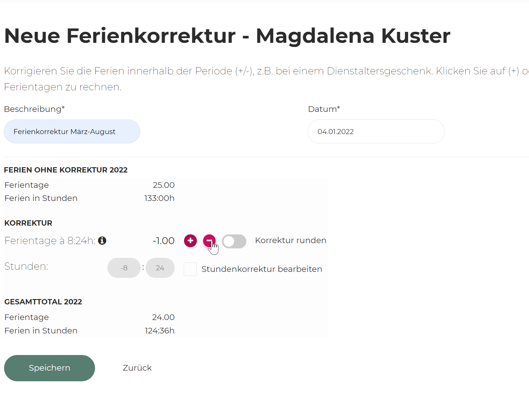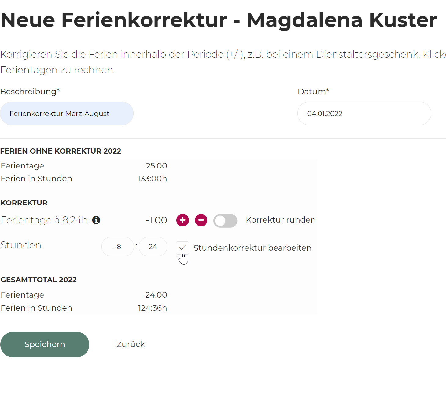 Beim Hinzufügen der Korrektur muss immer unterscheiden werden, ob es sich um eine Stundenkorrektur (Arbeitszeit) oder eine Ferienkorrektur handelt. Auch die Ferienkorrektur kann in Stunden sein, aber keine Arbeitsstunden.