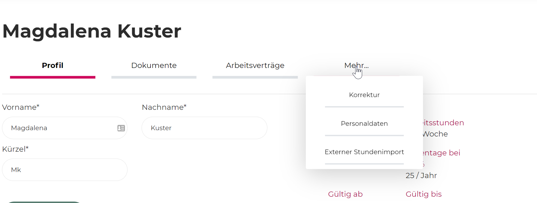 Unter mehr können die Korrekturen (Ferien, Überzeit) efasst werden