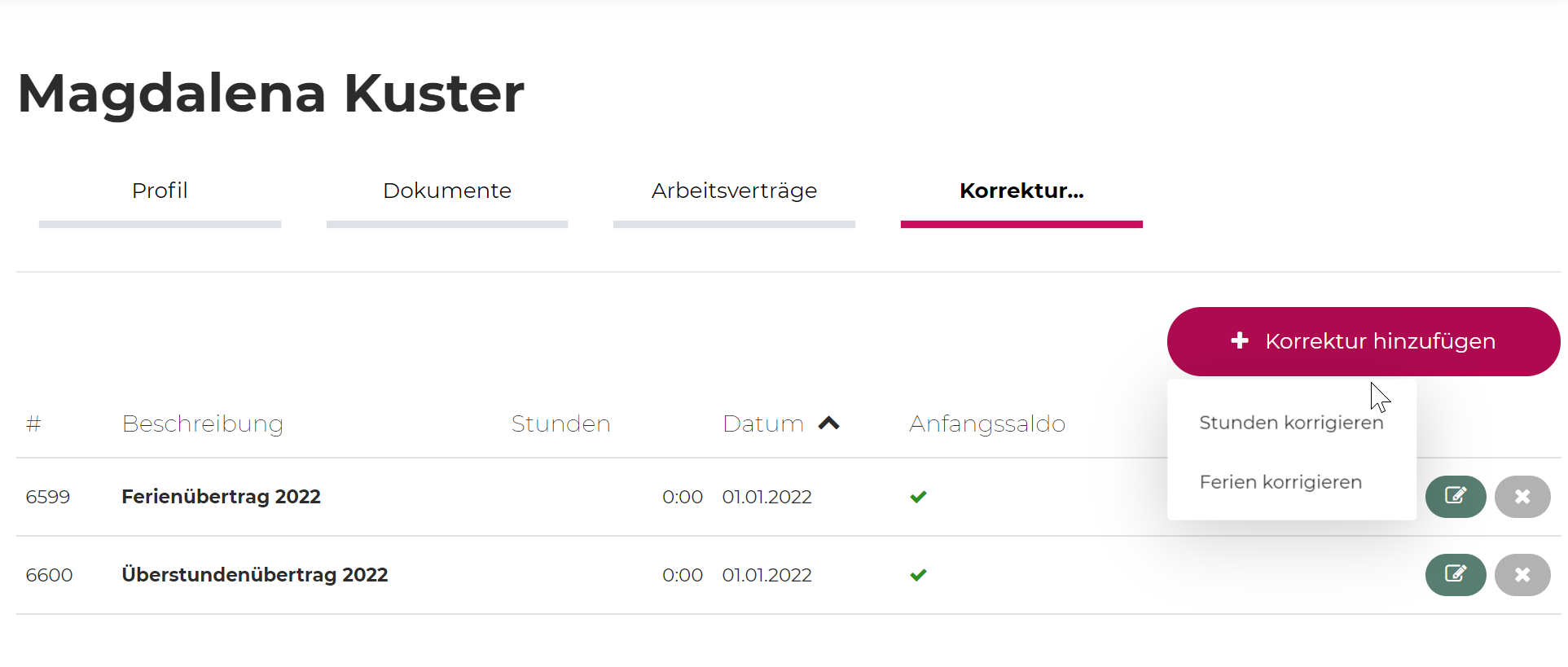 Das gleiche Vorgehen gilt bei der Stundenkorrektur.