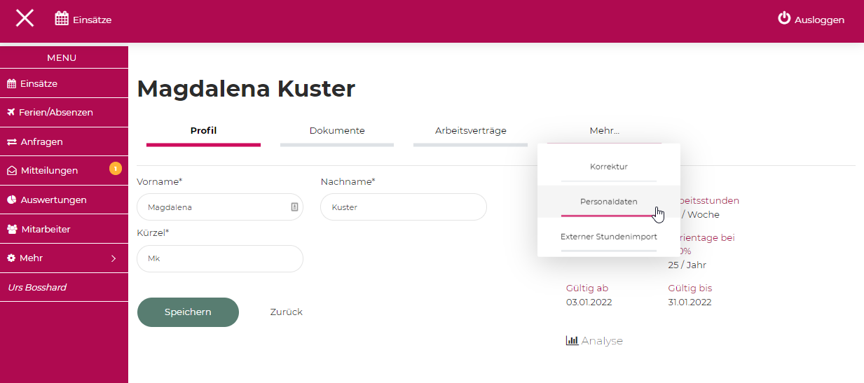 DIe Personaldaten werden unter dem Mitarbeitenden erfasst. Dazu wählen Sie auf der linken Navigation "Mitarbeiter" und gehen beim ensprechenden Mitarbeitenden auf Bearbeiten.
